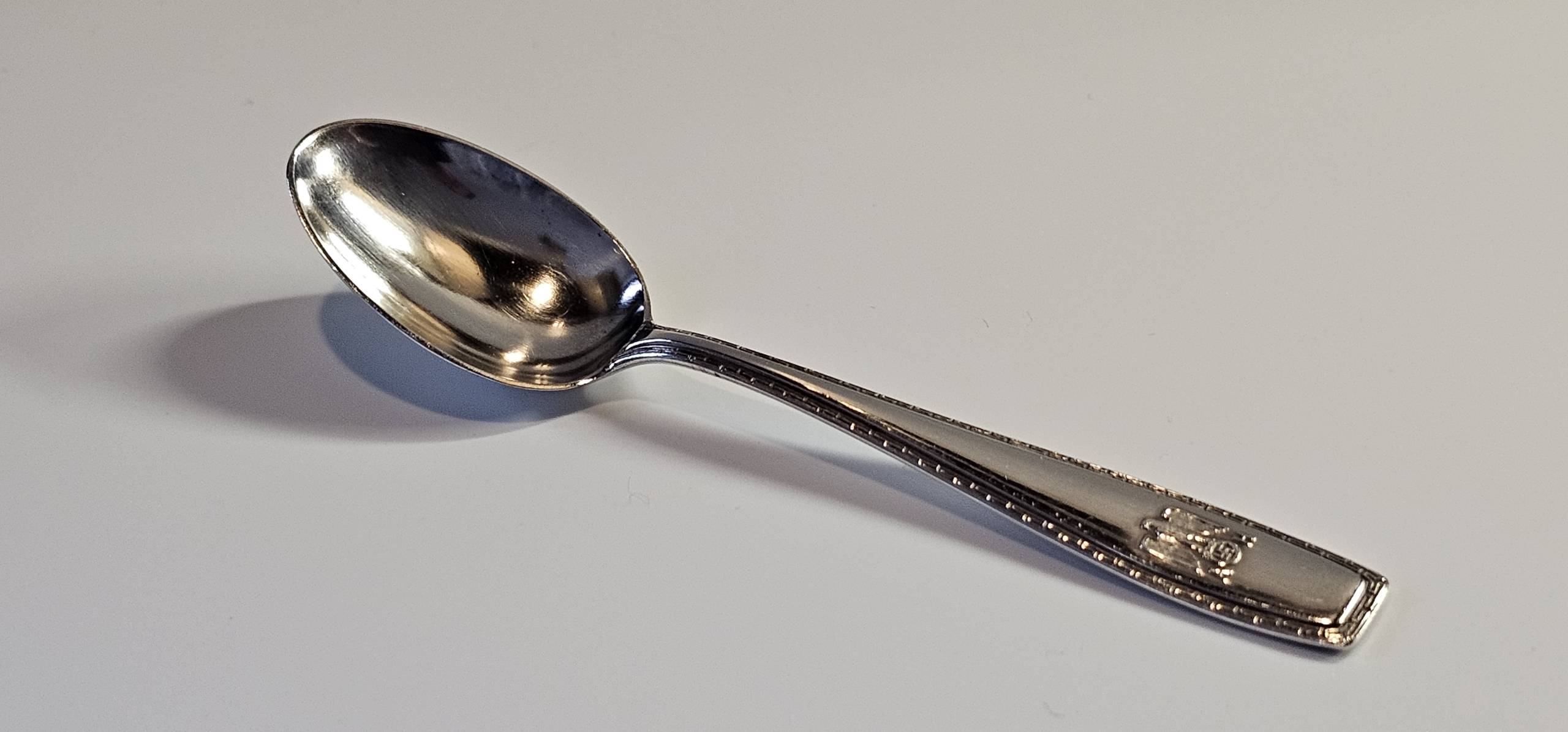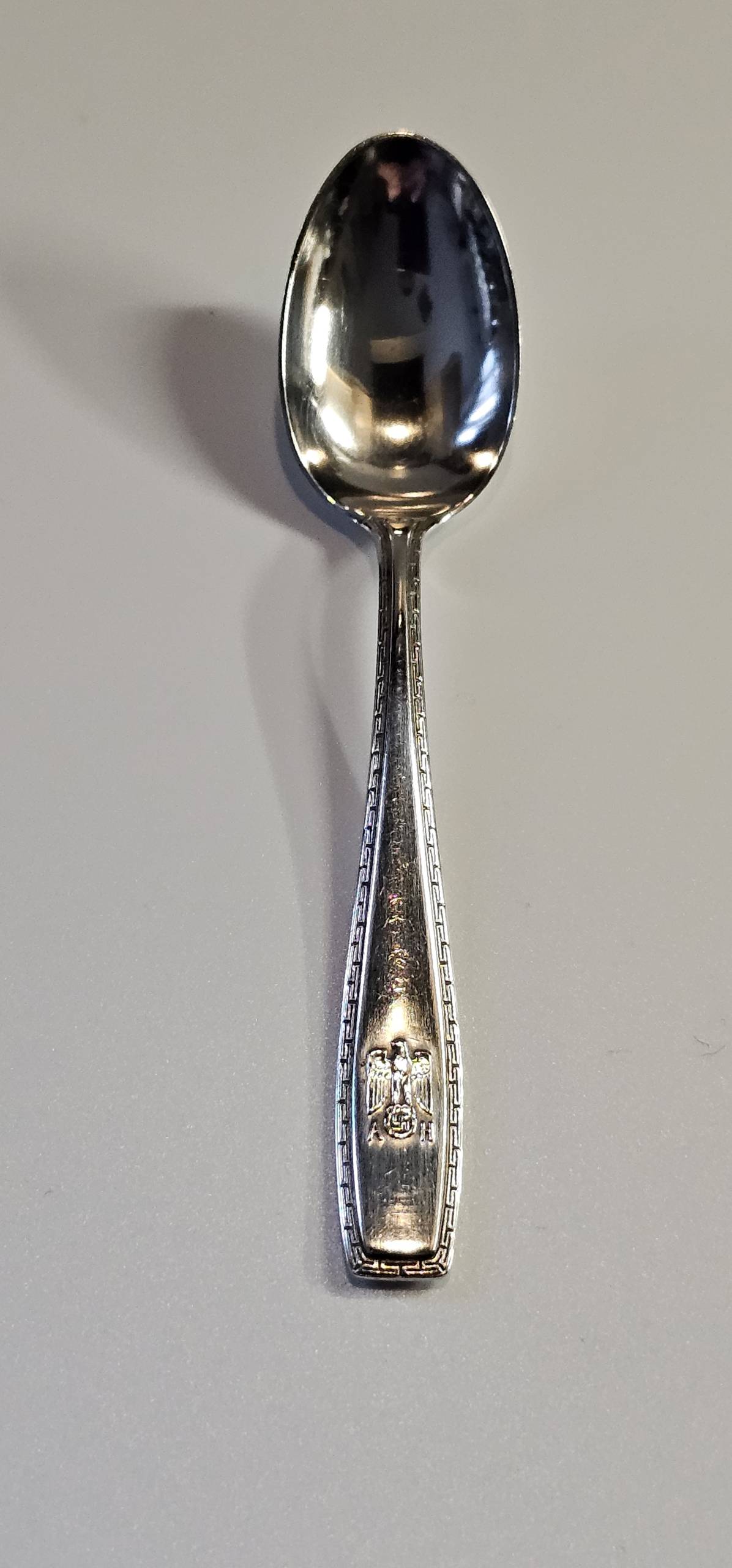 A superb little solid silver demitasse spoon from Adolf Hitler’s personal formal silverware, it features an embossed Fuehrer Adler (the Leader’s Eagle) clutching a wreathed Swastika which is flanked by Hitler’s initials ‘A’ & ‘H’. The reverse side of the spoon has the impressed hallmarks; a crescent moon, the imperial crown, the silver purity mark ‘800′, and the imperial eagle. There is a fabulous impressed greek-key ‘Meander’ border along all edges of the front side of the spoon handle. The detail of the embossing on this tiny spoon is quite spectacular.