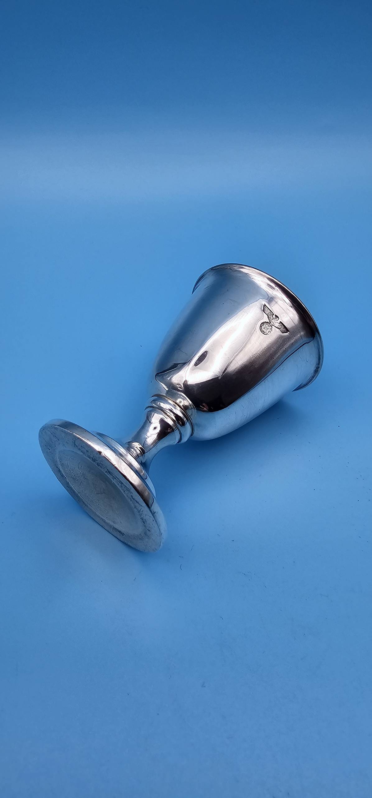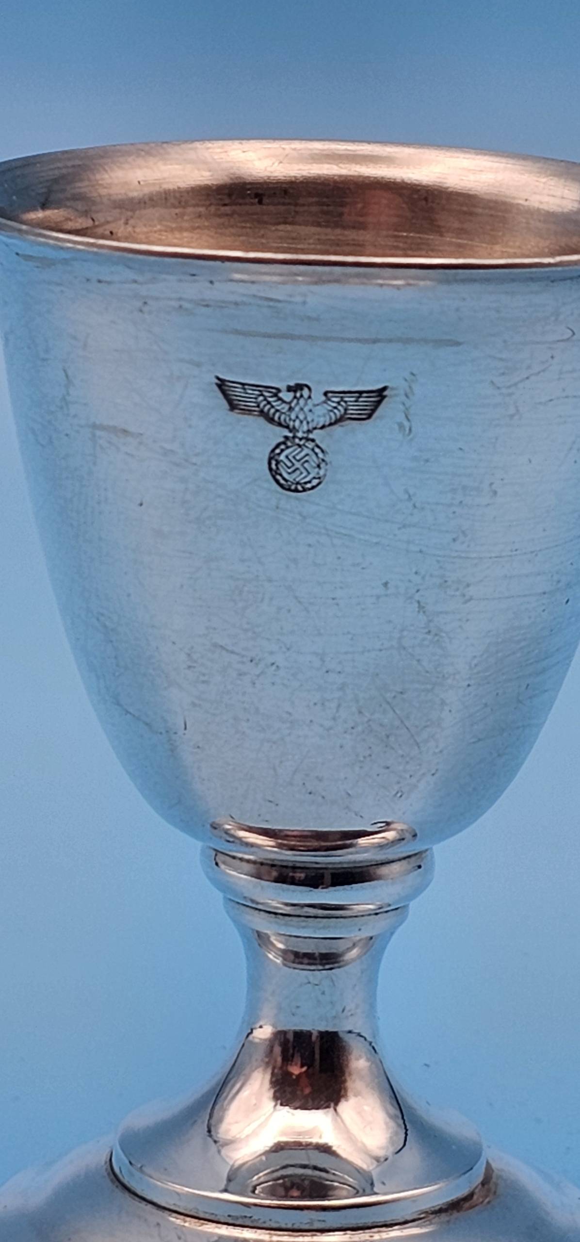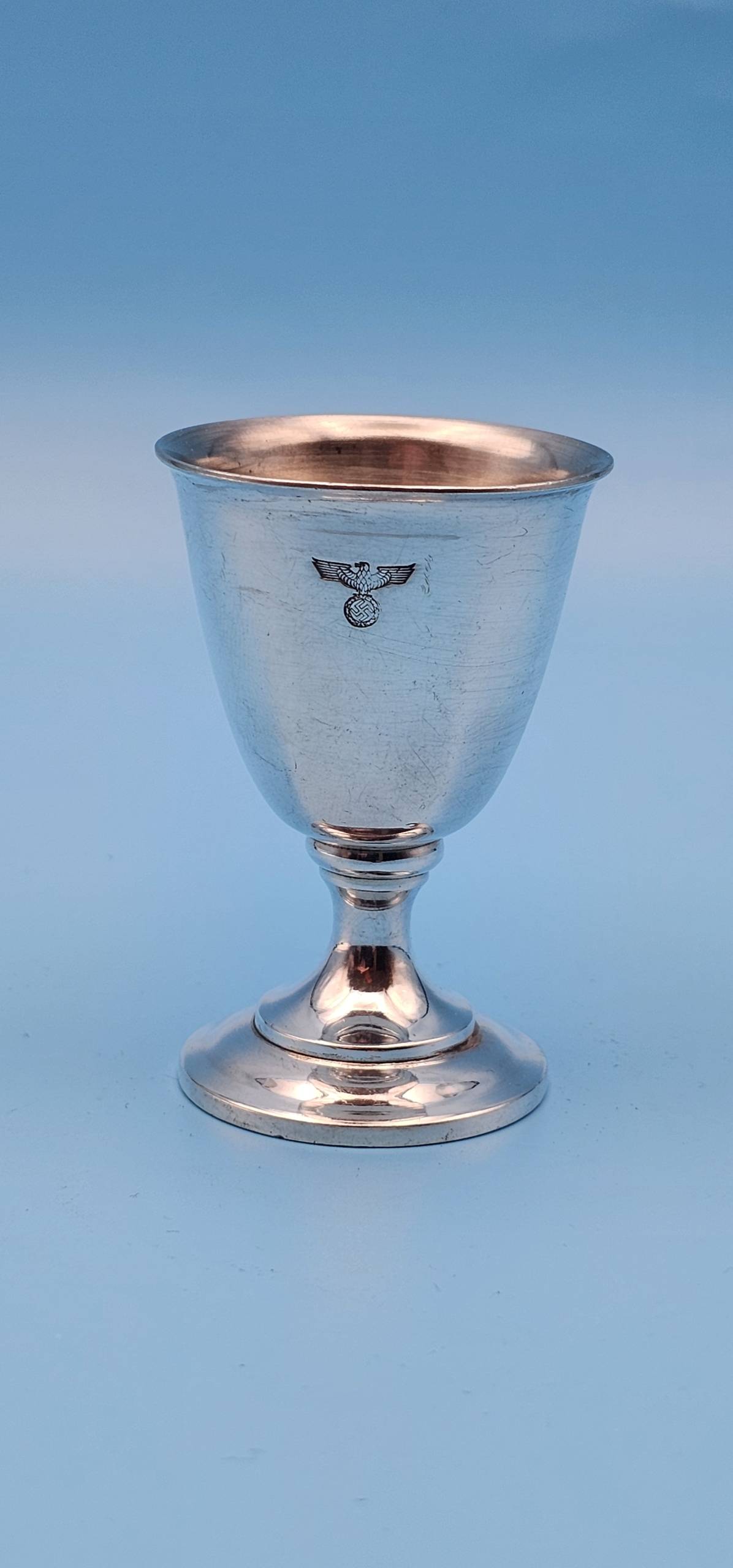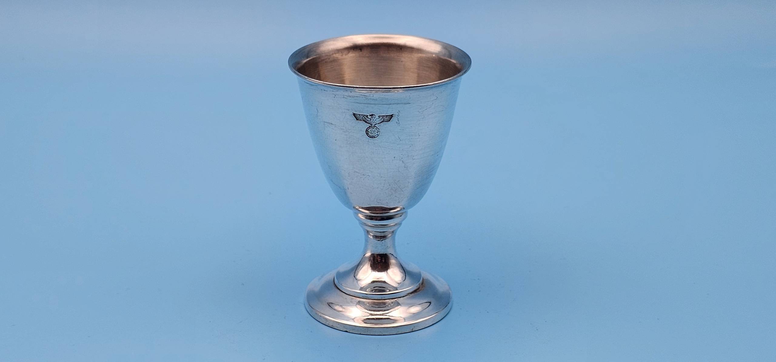 A fabulous silver plated eggcup by famous German silversmith Wellner. Used at formal gatherings and party meetings of the National Socialist German Workers’ Party (Nationalsozialistische Deutsche Arbeiterpartei). It is a lovely design, with a fluted body and weighted base. It displays a small engraved NSDAP Eagle & wreathed swastika centered to the upper front. To the reverse is found the maker mark ‘Wellner’, followed by a small circle with the number ‘2’, which indicates the silver content. A very rare, early, NSDAP Formal silver tableware piece.