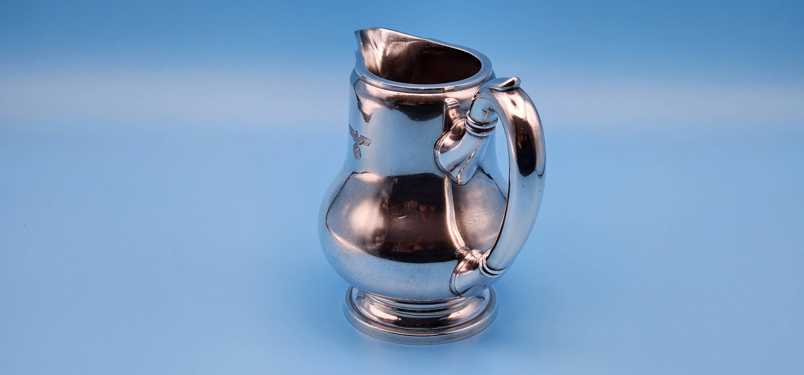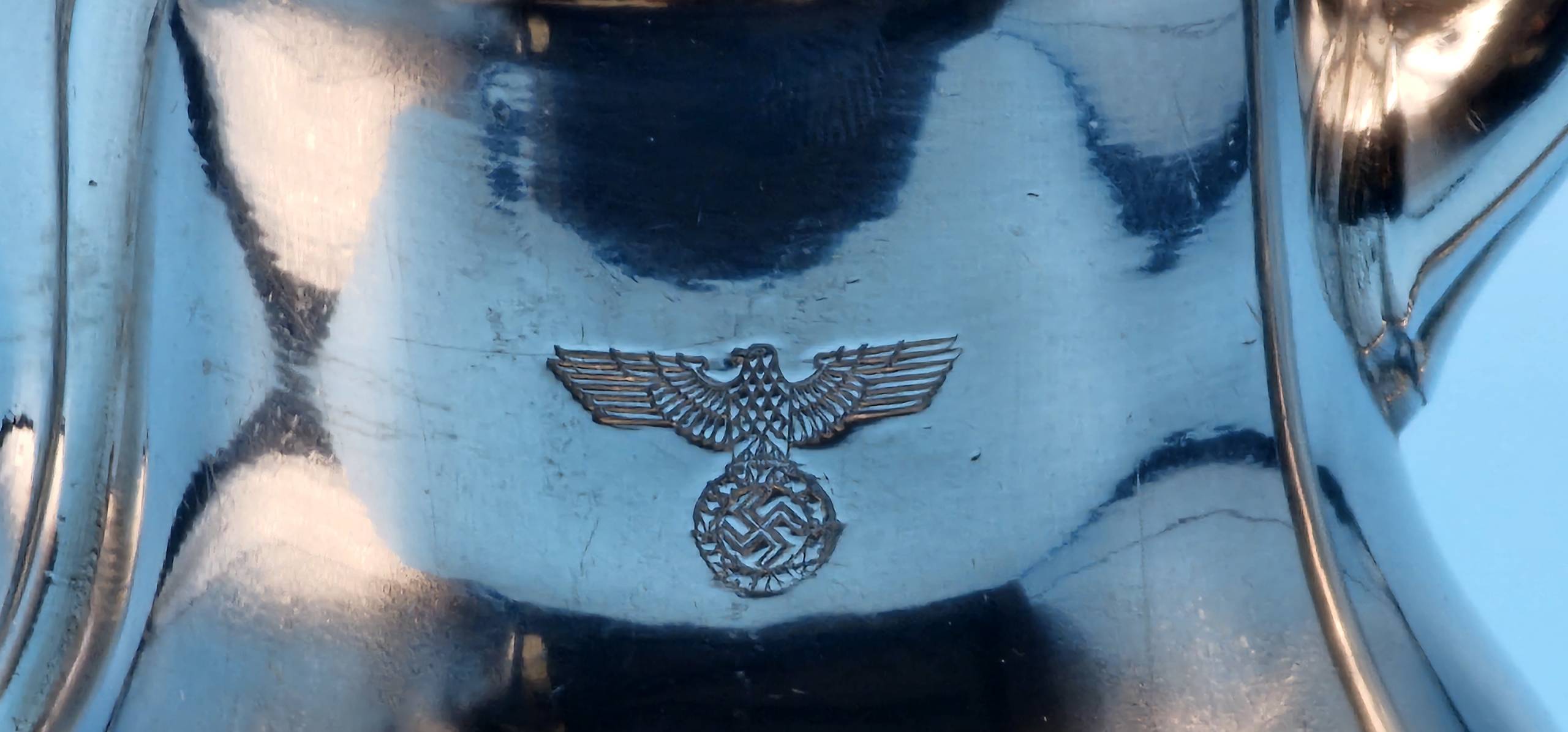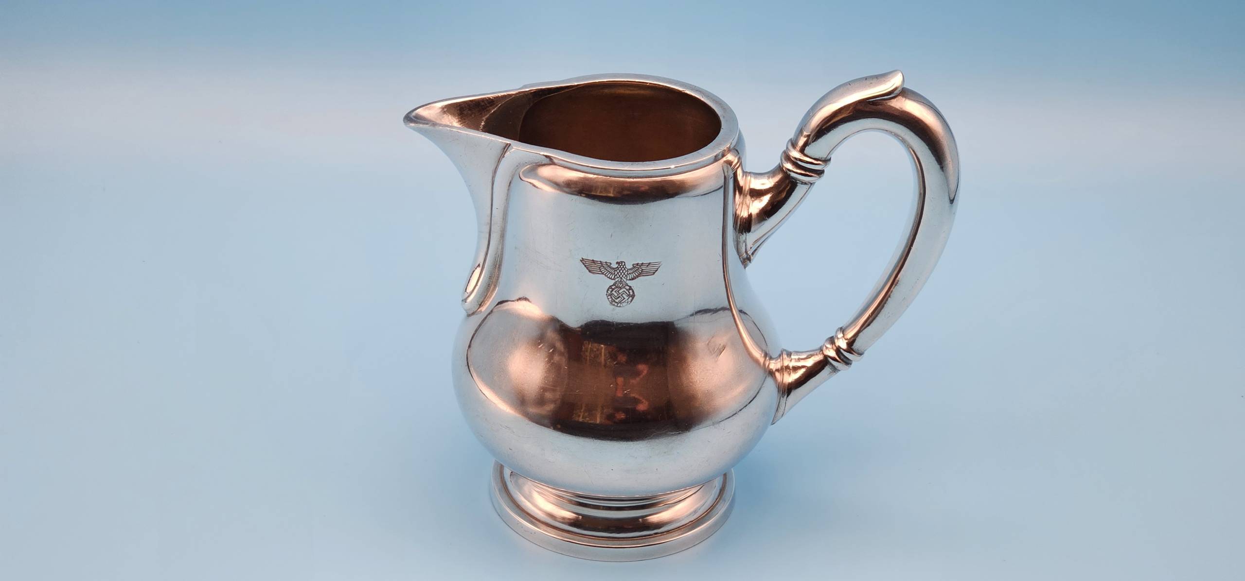 A fabulous little silver plated Milk Jug by famous German silversmith Wellner. Used at formal gatherings and party meetings of the National Socialist German Workers’ Party (Nationalsozialistische Deutsche Arbeiterpartei). It is a lovely design, of the same style as several other NSDAP formal silver pieces we currently have listed. It displays an engraved NSDAP Eagle & wreathed swastika centered to the upper front. To the base is found the maker mark ‘Wellner’, followed by 35cl, which means it will hold 350 mills, and then a small circle with the number ’14’, which indicates the silver content. A very rare, early, NSDAP formal silver tableware piece.