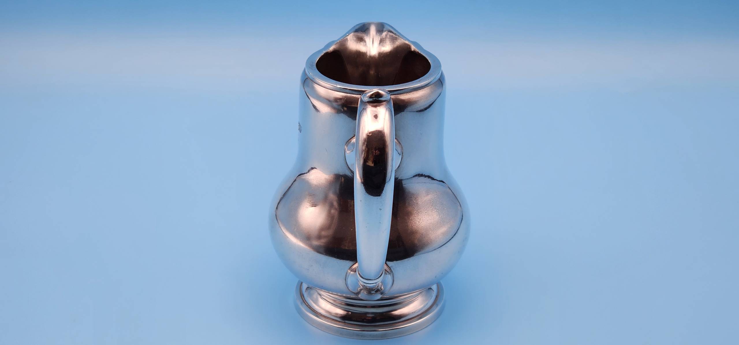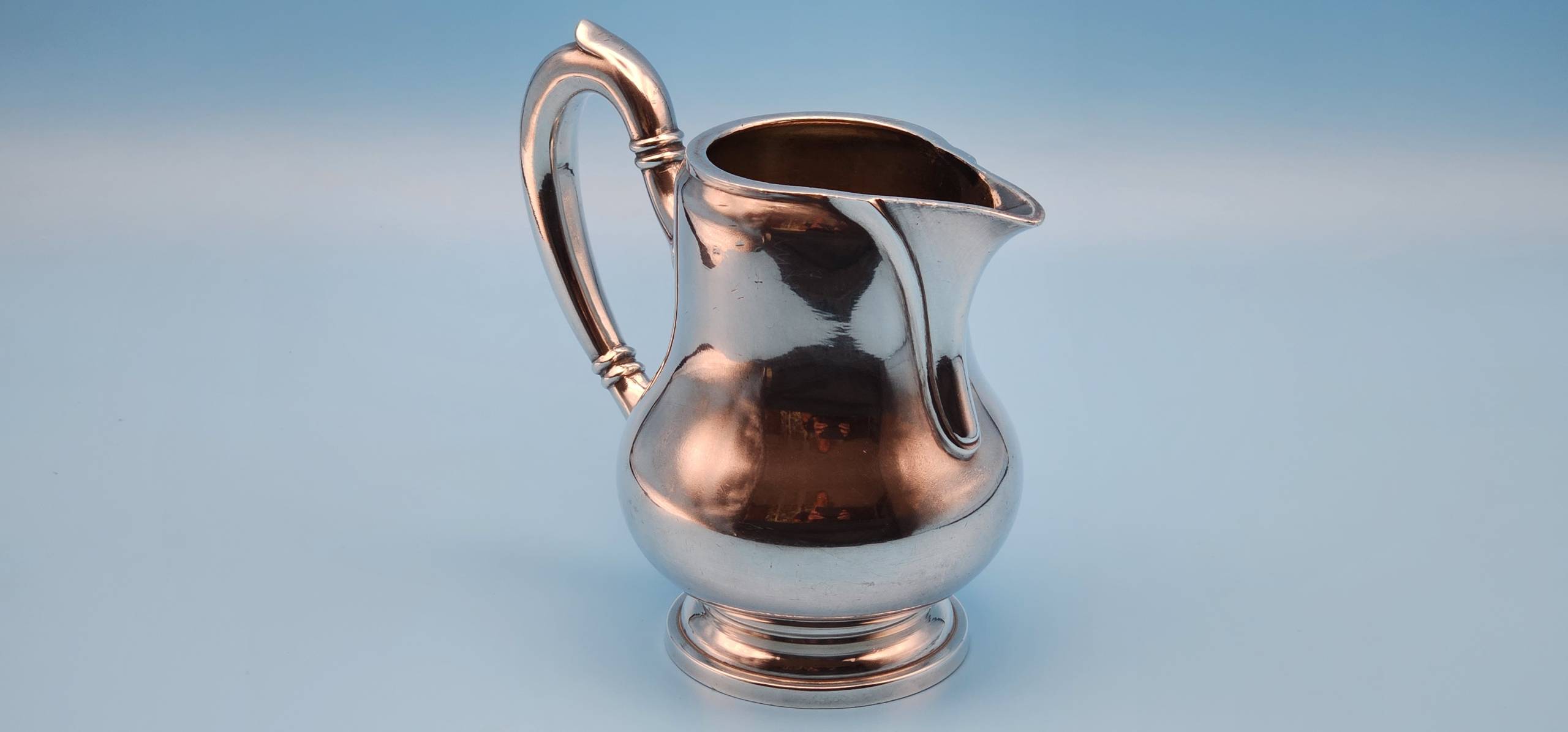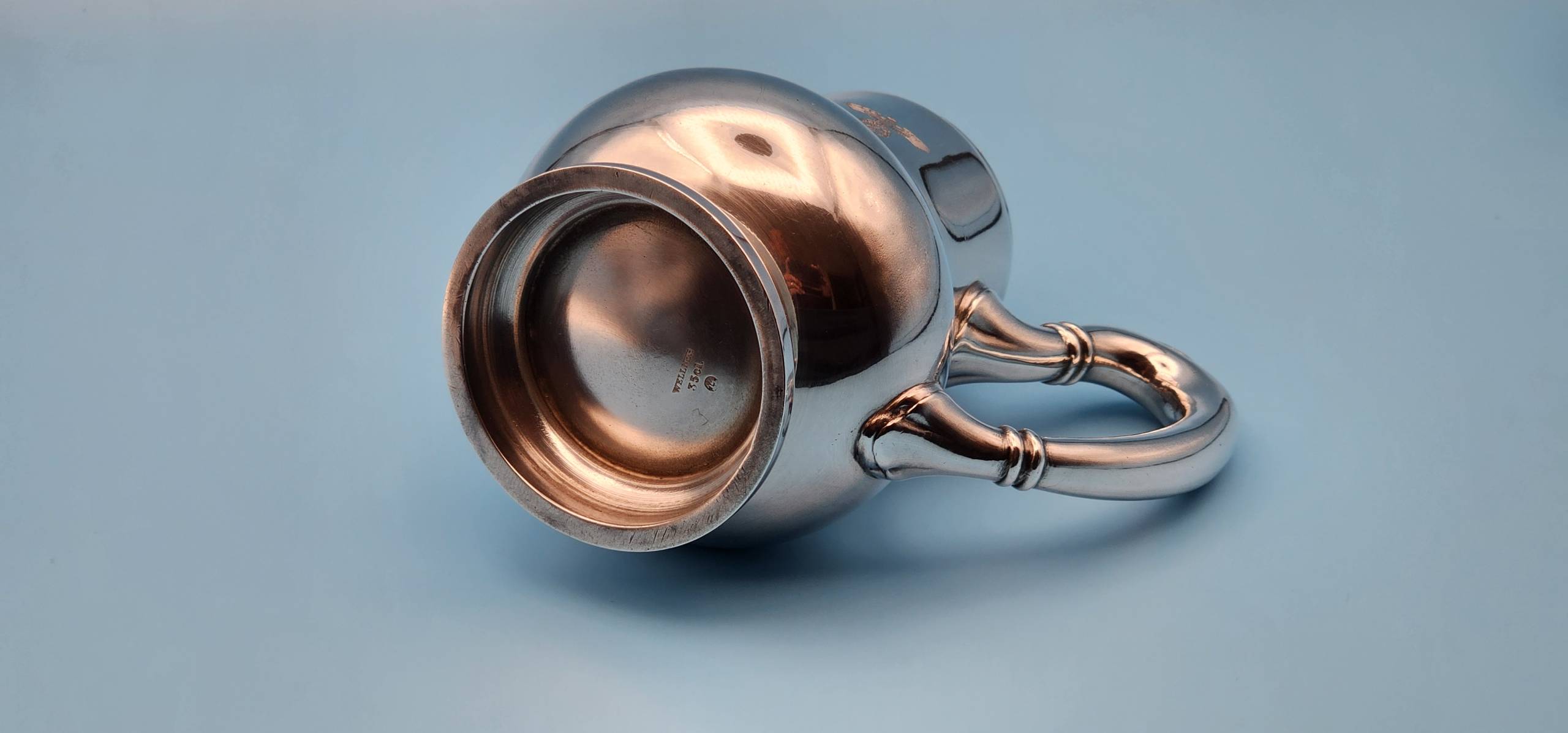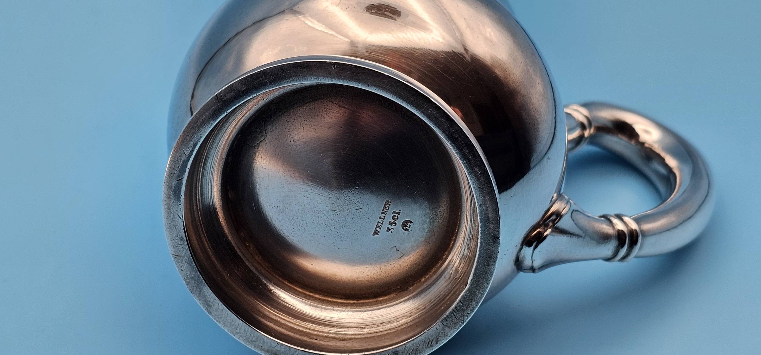 A fabulous little silver plated Milk Jug by famous German silversmith Wellner. Used at formal gatherings and party meetings of the National Socialist German Workers’ Party (Nationalsozialistische Deutsche Arbeiterpartei). It is a lovely design, of the same style as several other NSDAP formal silver pieces we currently have listed. It displays an engraved NSDAP Eagle & wreathed swastika centered to the upper front. To the base is found the maker mark ‘Wellner’, followed by 35cl, which means it will hold 350 mills, and then a small circle with the number ’14’, which indicates the silver content. A very rare, early, NSDAP formal silver tableware piece.